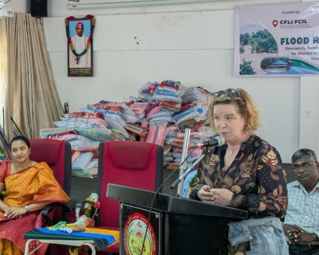 The event was honored by the presence of Her Excellency Isabelle Martin, High Commissioner of Canada to Sri Lanka and the Maldives, who personally participated in the distribution of relief items and expressed solidarity with the affected communities.
